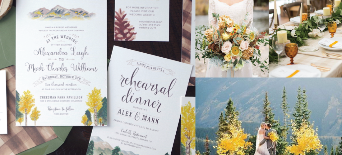 The Alex Suite is the quintessential invitation set for any Rocky Mountain fall wedding! Hand painted watercolor mountainscapes covered in golden fall foliage along with yellow aspens and evergreens will … Continue reading Rustic Fall Mountain Wedding Inspiration | Alex Suite